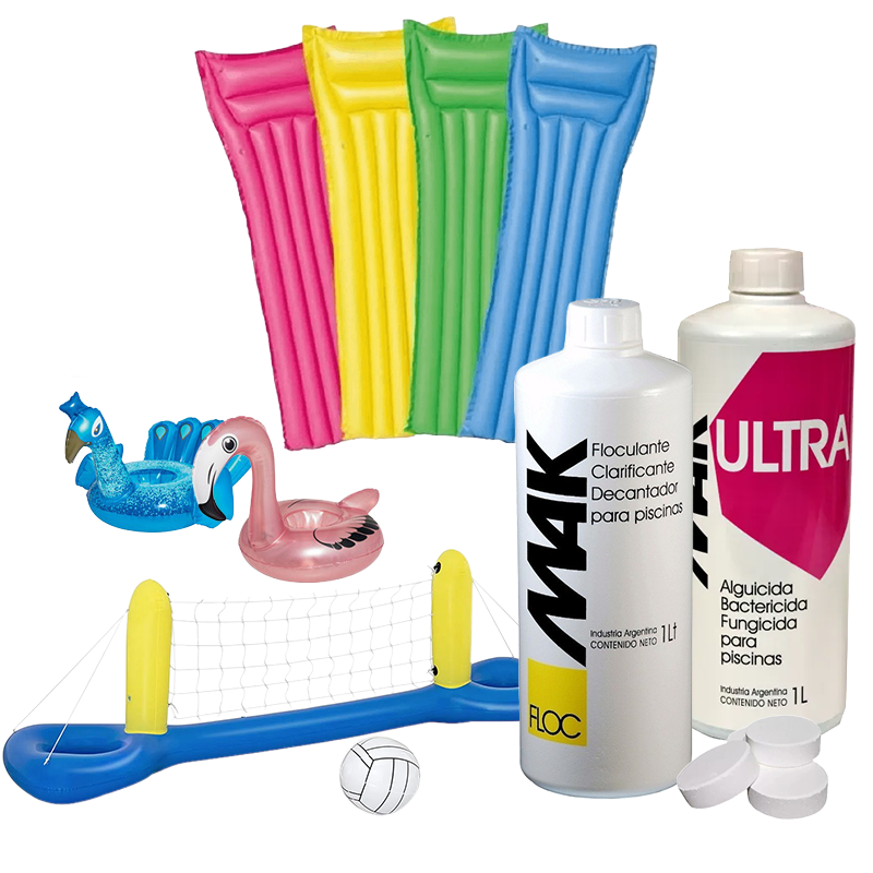 Transformá tu piscina en el epicentro del entretenimiento y el mantenimiento con este completo kit que combina diversión y cuidado del agua para que tú y tus invitados disfruten sin preocupaciones.